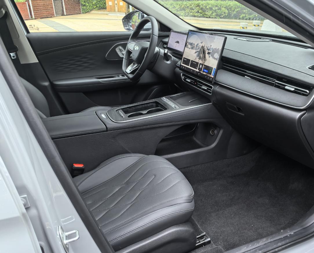 車內的一體式雙聯屏被一塊15.6英寸的2.5K懸浮式中控屏和矩形全液晶儀表盤所取代,緊跟現代汽車設計的潮流。