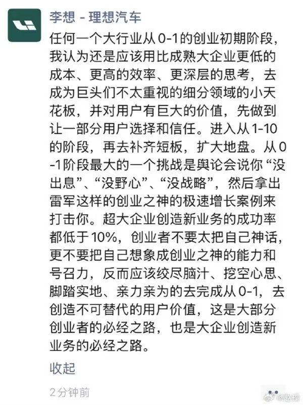 極越事件尚在幾方協同處理中,圈內不少人也都讀到了夏一平的反思小作文。網傳久未冒泡的李想發了一個朋友圈。