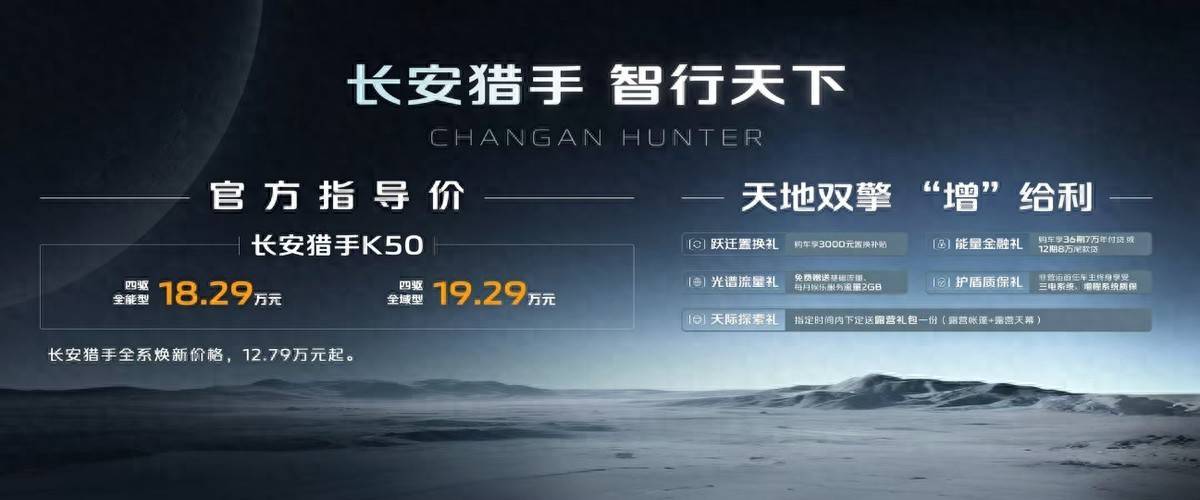 長安獵手K50四驅全域型,官方指導價19.29萬元;長安獵手K50四驅全能型,官方指導價18.29萬元。另外,長安獵手同步煥新,全系產品12.79萬元起。