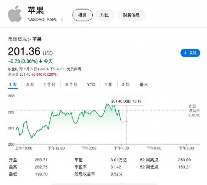 消息傳出后,蘋果股價周四下午曾短暫上漲,但最終收跌0.36%,報201.36美元。今年截至周三收盤,蘋果股價已累計下跌19%。