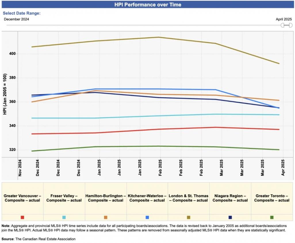 多倫多在5個(gè)月內(nèi)下跌了6.2%,而被視為大多外圍通勤圈的幾個(gè)區(qū)域跌得更慘,分別是:倫敦市(London)下跌7.7%,基奇納-滑鐵盧地區(qū)(Kitchener-Waterloo)下跌7.6%,尼亞加拉地區(qū)(Niagara)下跌6.9%,漢密爾頓(Hamilton)下跌6.5%。與此同時(shí),大溫地區(qū)和菲莎河谷也在4個(gè)月內(nèi)下跌了2.8%。