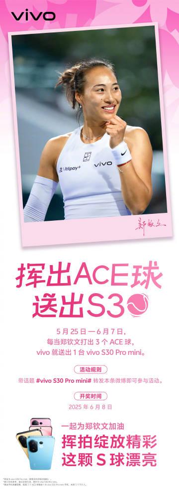 在即將于本月29日登場的vivo S30系列與vivo S系列美學大使奧運網球冠軍女神一同攜手。在2025法網期間,每當奧運冠軍女神揮出3個ACE球,vivo官方就會在微博抽選一位用戶送出1臺 vivo S30 Pro mini!讓我們一同與奧運冠軍一起體驗vivo S30系列夏日精彩時刻!