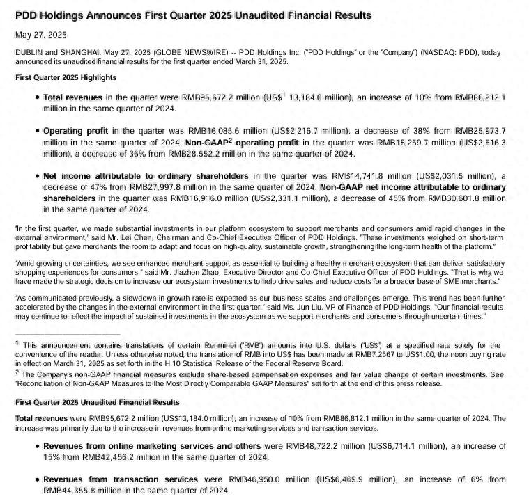 今日,拼多多公布2025年第一季度未經審計財務業績。
