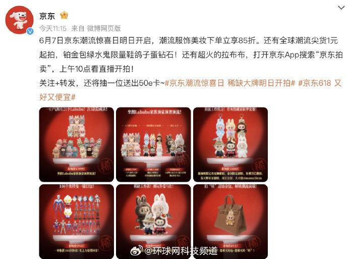 據悉,主要拍賣集中在6月7日19:00-20:00的“潮流日驚喜”專場。部分商品(如愛馬仕Birkin包搭配Labubu盲盒)則參與上午10點的直播拍賣活動。