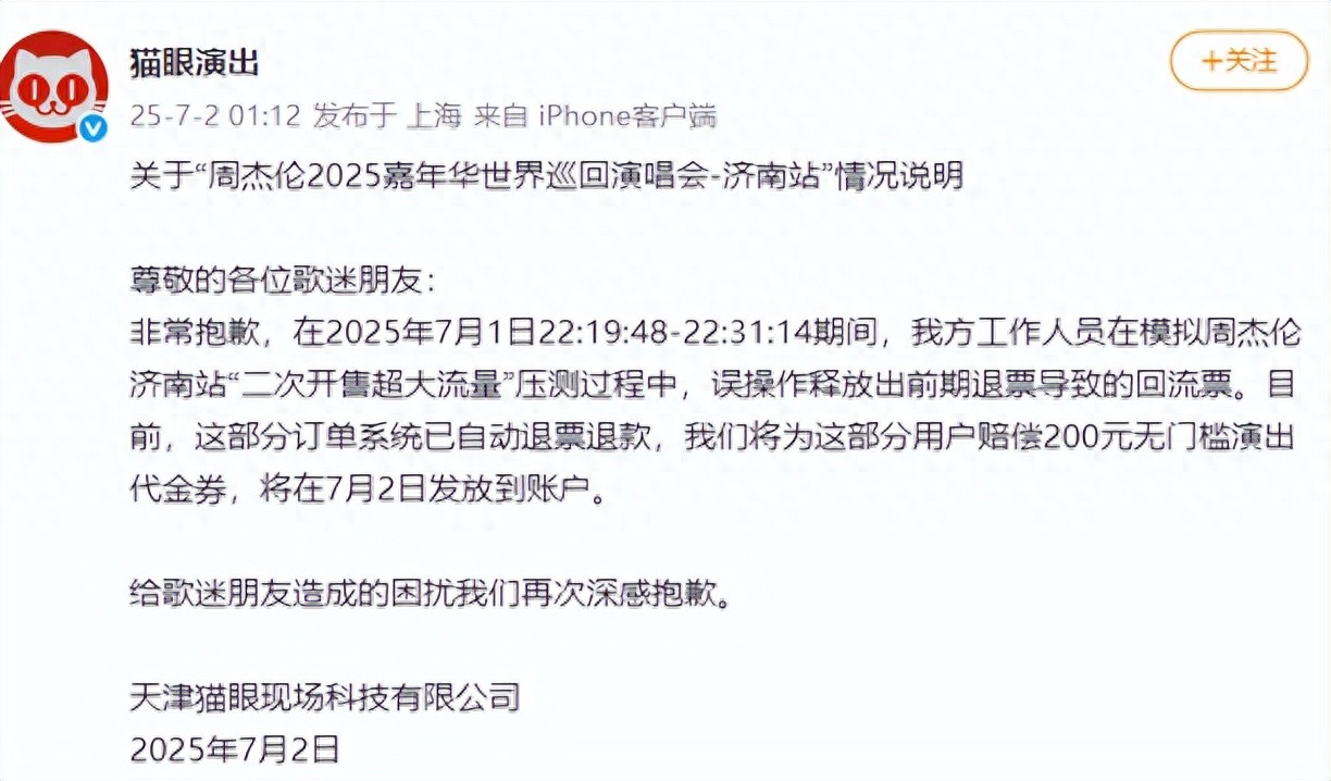 今天凌晨,貓眼演出發布《關于“周杰倫2025嘉年華世界巡回演唱會-濟南站”情況說明》,稱在2025年7月1日22:19:48-22:31:14期間,工作人員在模擬周杰倫濟南站“二次開售超大流量”壓測過程中,誤操作釋放出前期退票導致的回流票。目前,這部分訂單系統已自動退票退款,貓眼將為這部分用戶賠償200元無門檻演出代金券,將在7月2日發放到賬戶。