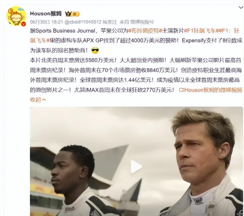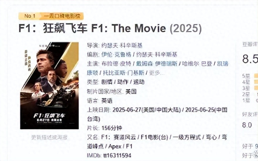 他主演的電影《F1:狂飆飛車》上映沒兩天,就收獲豆瓣8.5分的高評價。