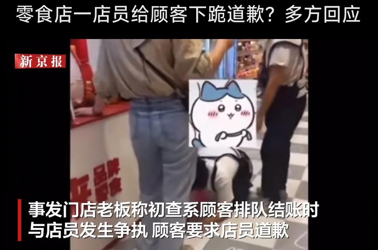 最近網上火了一段視頻,江蘇連云港一家“好想來”零食店里,一個穿著工作服的店員,“撲通”一聲,直接跪在了一位顧客面前。