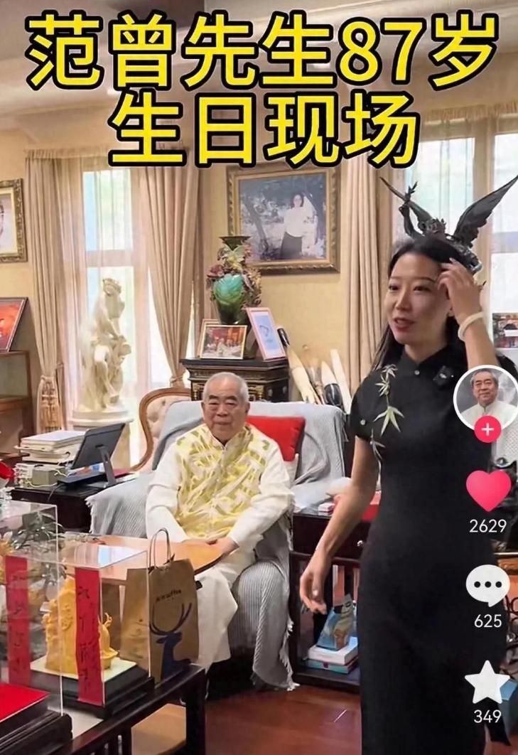 范老爺子在客廳沙發(fā)上笑容滿面,助理獻(xiàn)花增添喜慶。87歲高齡的他白發(fā)蒼蒼,卻氣色紅潤,眉毛烏黑,穿金色繡花中式西裝和布鞋,融合傳統(tǒng)與樸實(shí)。