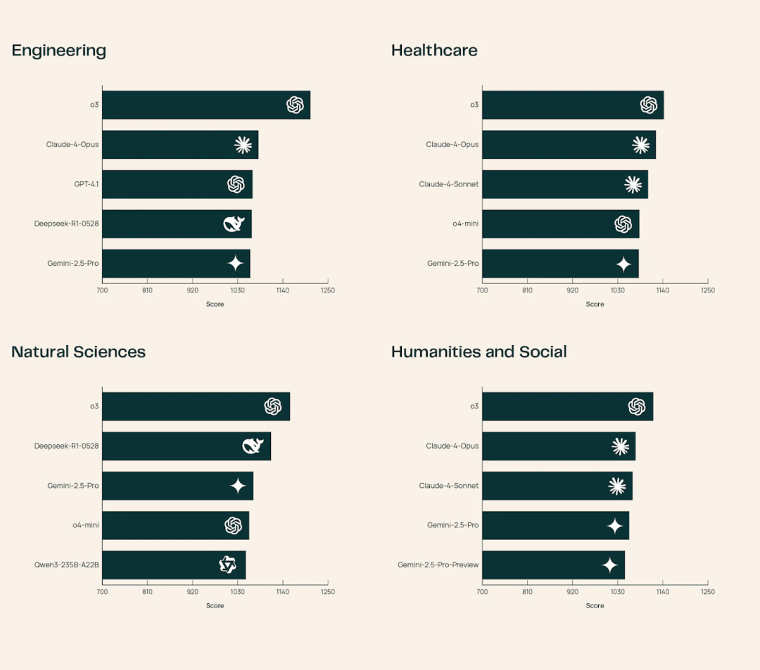 例如Claude-4-Opus的醫療健康知識很強,而DeepSeek-R1-0528在自然科學表現搶眼。