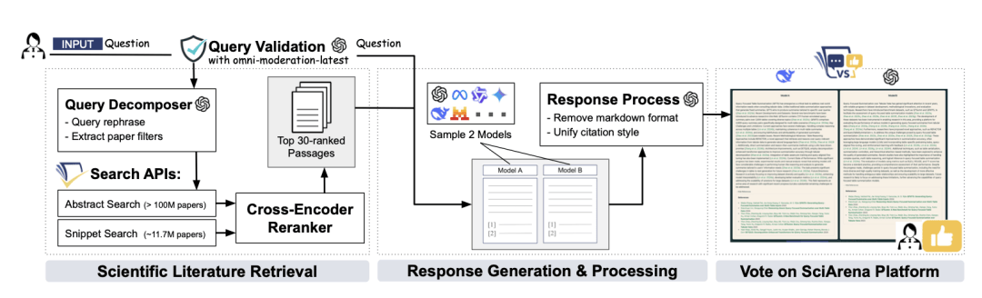 SciArena的工作流程包括檢索論文、調用模型回復、用戶評估三個環節。