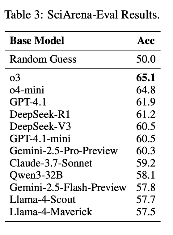 SciArena-Eval: 基于SciArena平臺收集的人類偏好數據構建的元評估基準集,其核心目標是檢驗用模型來猜測人類偏好的準確性。