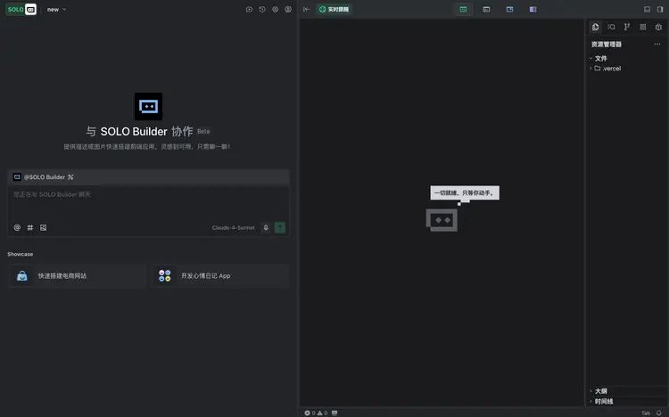 TRAE SOLO界面被分成了幾個區域。左側是核心的對話區,是我們與SOLO Builder(使用的是使用Claude 4)這個Agent溝通的地方。