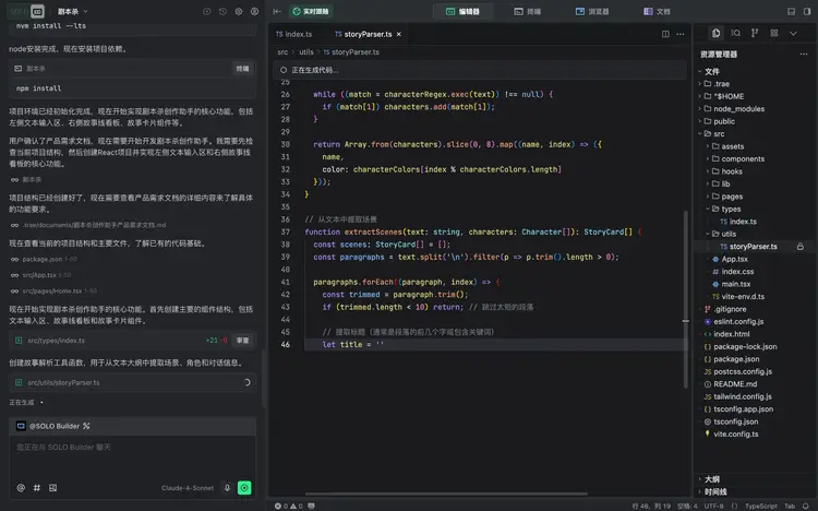 在獲得我們確認后,它便開始了自主構建。看著終端里自動滾動的npm install日志和編輯器里新增文件目錄 ,確實有種指揮AI干活的“爽感”。