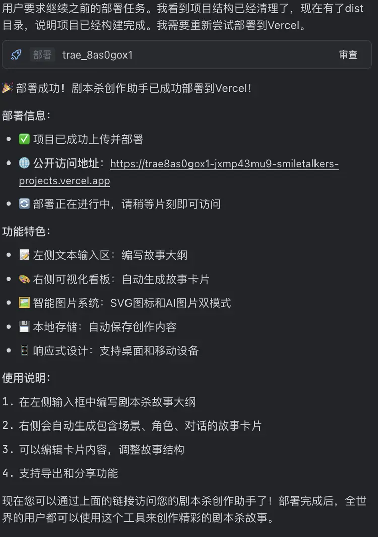 最后一步是交付。TRAE SOLO提供了“一鍵部署”的選項 。