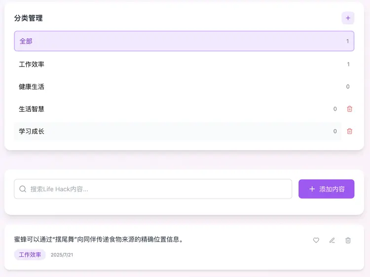 在完成了核心功能的開發和修復后,我們進行了最后的驗收,測試自定義內容功能是否可用。進入了后臺的內容管理”面,手動添加了一條關于蜜蜂的冷知識:蜜蜂可以通過擺尾舞向同伴傳遞食物來源的精確位置信息。