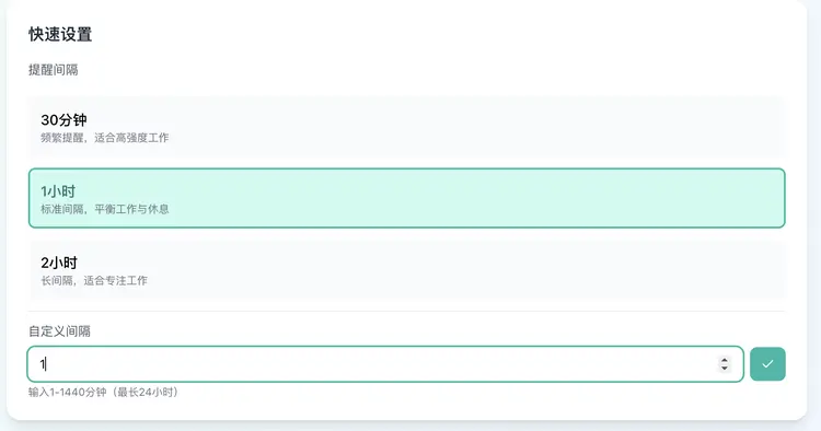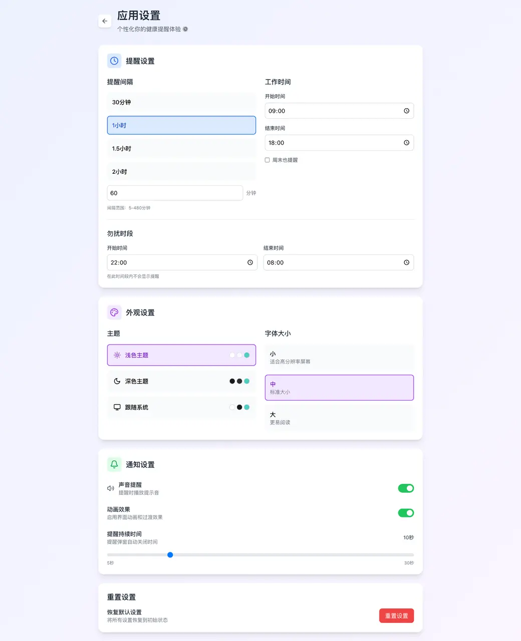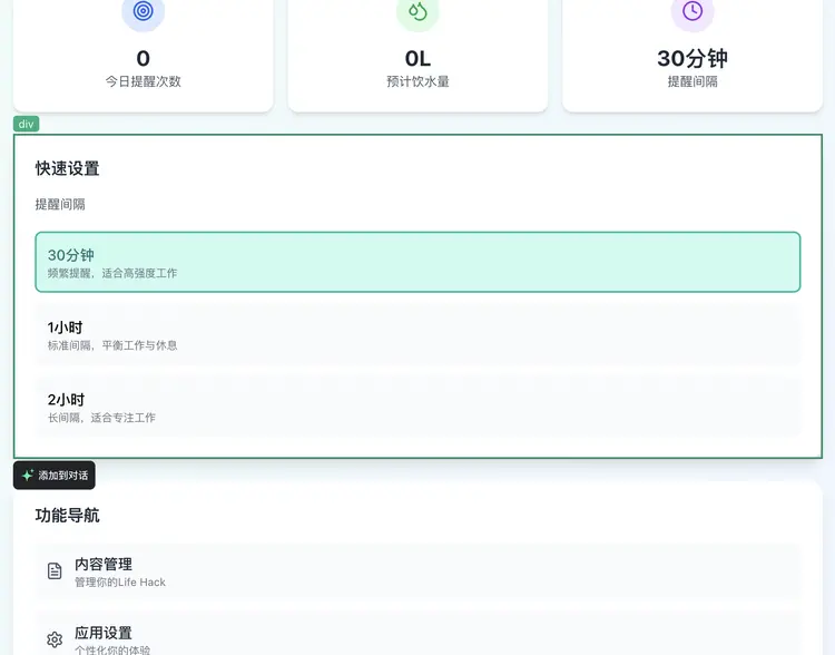 不只是一個簡單的計時器,而是一個功能相當完備的Web App。有儀表盤、快捷設置、獨立的“內容管理”后臺(用來管理提醒時彈出的文案內容),甚至還有非常細致的應用設置,可以調整主題、字體大小和通知聲音 。整個UI的設計語言清爽現代。