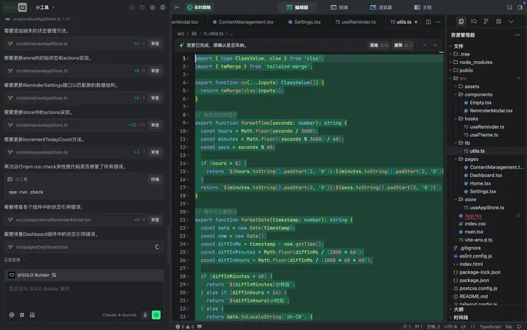 TRAE沒有要求我們提供更多信息,而是開始像一個真人開發者一樣,有條不紊地排查問題。它先是檢查了按鈕的點擊事件和定時器設置,然后把嫌疑鎖定在了useReminder hook和store中的狀態管理上。