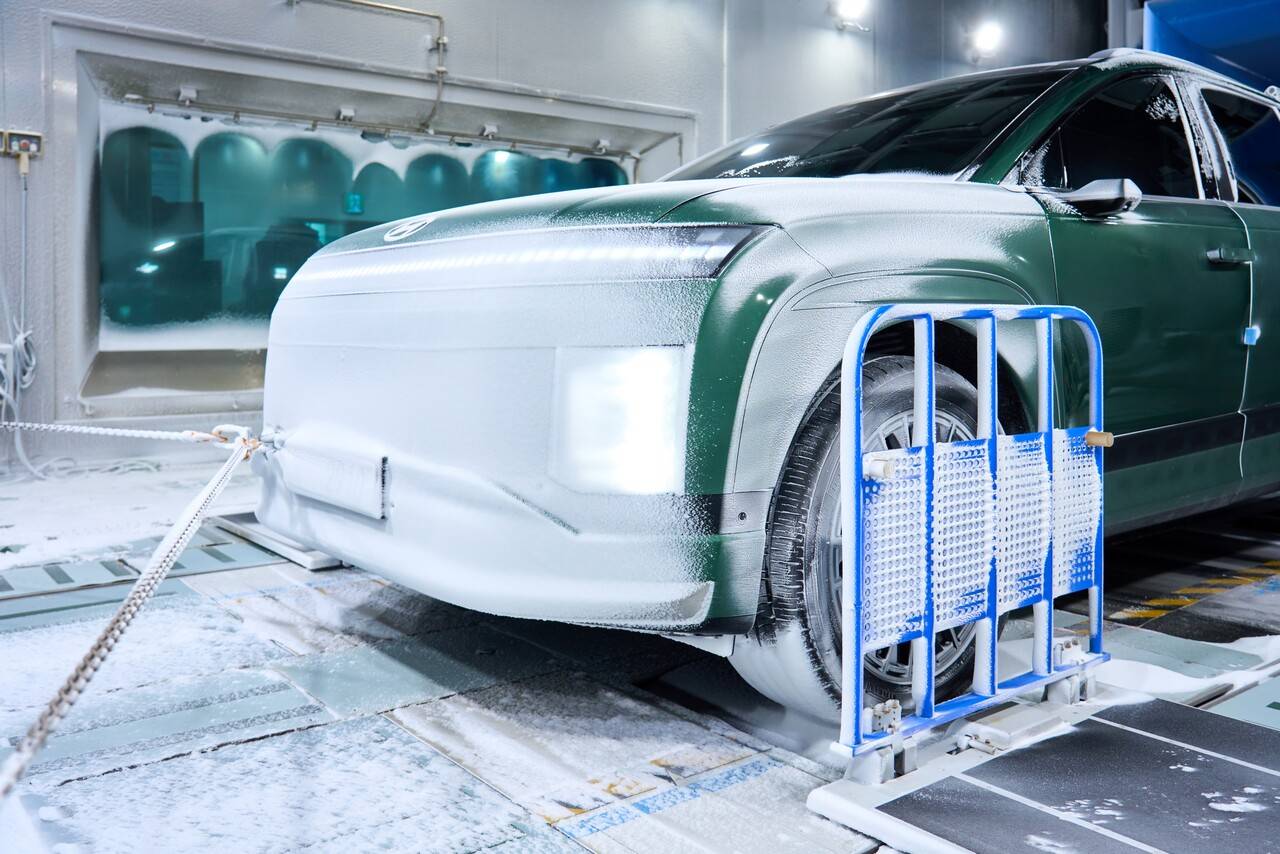 圖注:在環境測試室降雪 chamber 內,對現代汽車艾尼氪 9 進行降雪測試的場景。