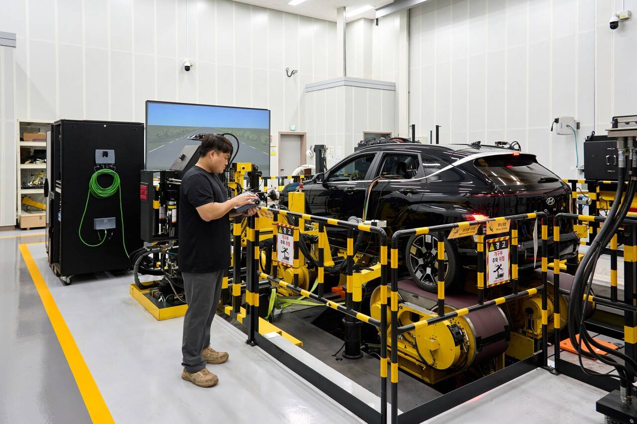 圖注:在操控行駛試驗機上,對kona EV的操控特性進行測試的場景。