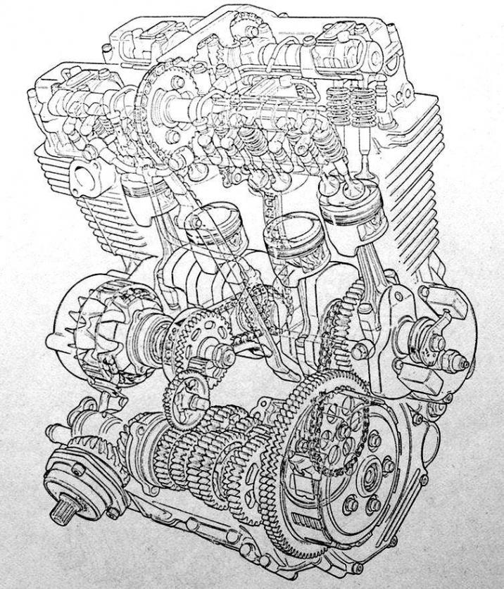 搭配的是六速常時嚙合式變速箱,傳動則使用巡航車少見、維護便利的軸傳動(Shaft Drive)。 另外還有油壓式離合器、油壓自動氣門間隙調整裝置,以及背面發電機(rear generator)這些配備,在當年可是頗有高級感的設定。