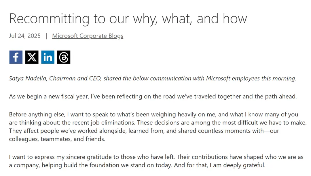 在這篇博客中,納德這樣安撫剩余員工:「盡管本月的裁員導(dǎo)致9000人失去工作,但微軟依然蒸蒸日上」
