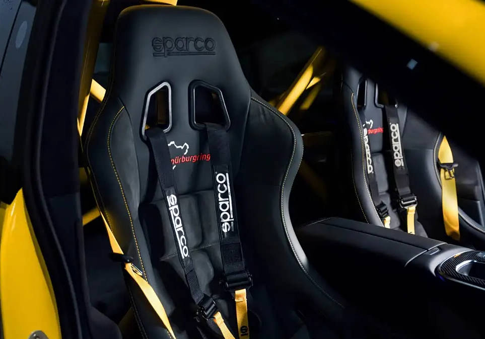 車內最大的亮點是使用了專業的賽車桶椅,并標配六點式安全帶,同時車內后排還增加了防滾架,在保障安全的同時,也強化了賽道氛圍。車輛內部采用了大量碳纖維裝飾板進行點綴,而且在中控副駕位置鑲嵌了限量版的銘牌標識,讓車輛的獨特性更加突出。