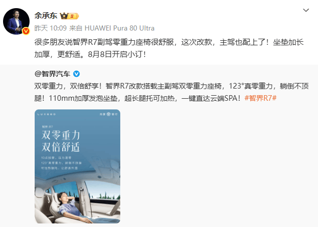 值得注意的是華為常務董事、終端BG董事長余承東還宣布,改款智界R7新車將于8月8日開啟小訂。