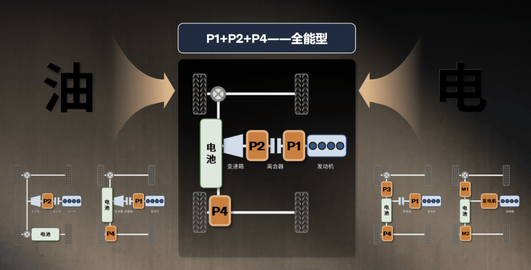 首先做幾個名詞解釋。在接下來談到的混動技術構型中,都會用到一個“P(n)電機”的名字,其中P即Position(位置),n為阿拉伯數字0~4,數字越大越“厲害”,數字越小越靠近發動機,傾向發電功能。