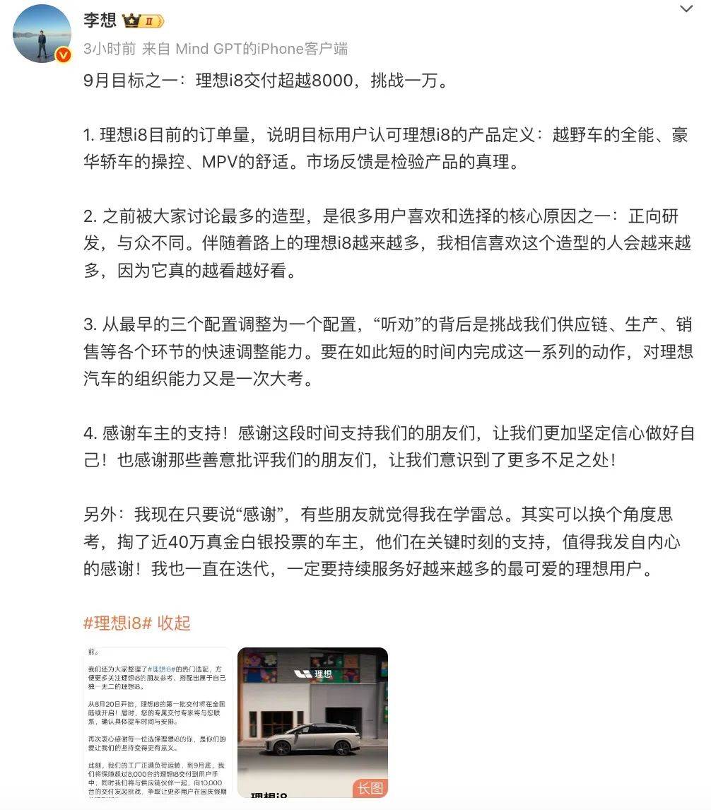 “市場反饋是檢驗(yàn)產(chǎn)品的真理。”李想表示, 理想i8目前的訂單量,說明目標(biāo)用戶認(rèn)可理想i8的產(chǎn)品定義:越野車的全能、豪華轎車的操控、MPV的舒適。雖然理想一直未公布i8的訂單數(shù)據(jù),但從李想的這一描述以及9月銷量目標(biāo)來看,i8目前收獲的訂單數(shù)據(jù)應(yīng)該還是不錯(cuò)的。
