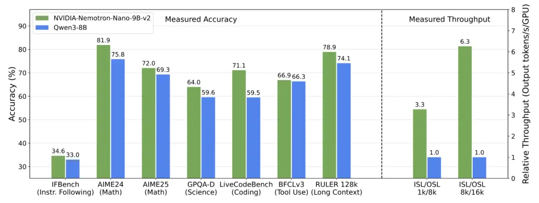 技術報告顯示,Nemotron Nano v2在復雜推理基準測試上的準確率與同等規模的領先開源模型Qwen3-8B相當或更高,同時吞吐量——也就是模型速度——最高可提升6倍。
