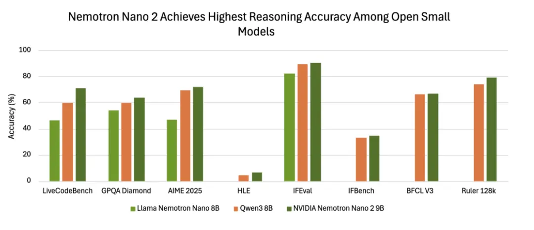 無論是前段時間發布的Llama Nemotron Super v1.5,還是這次的Nemotron Nano v2,對標的也是國內開源模型Qwen3。