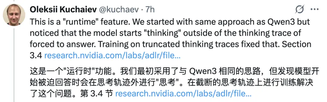面對網友“思考預算控制是如何實現的”的問題,英偉達的模型訓練師Oleksii Kuchaiev表示: