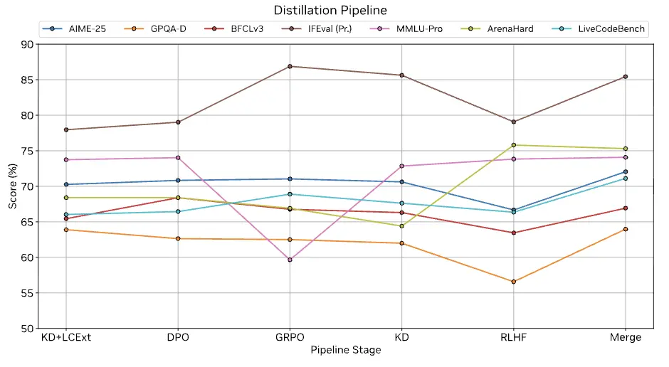 壓縮:最后,基礎模型和對齊模型均經過壓縮(剪枝和蒸餾),支持在單個NVIDIA A10G GPU(22 GiB 內存,bfloat16 精度)上進行128k token的上下文推理。這一成果是通過擴展基于Minitron的壓縮策略實現的,該策略專門針對受限條件下的推理模型壓縮需求而設計。