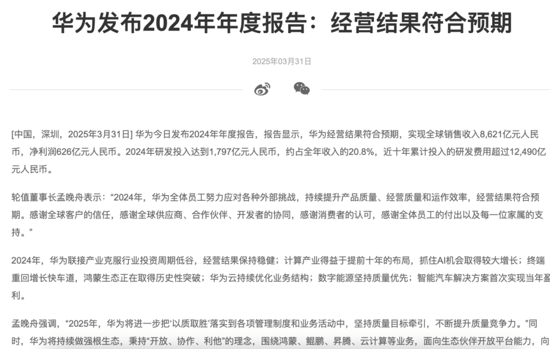 根據華為2024年年報,其全球銷售收入達8621億元,同比增長22.4%,凈利潤626億元,創史上第二高收入。其中,智能汽車解決方案首次實現當年盈利,以474.4%的收入增速成為最亮眼的增長極,全年營收達263.53億元。