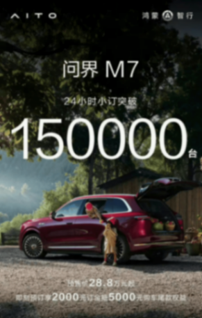 24小時,訂單突破15萬臺。當(dāng)全新問界M7預(yù)訂開啟后的數(shù)據(jù)發(fā)布時,其驚人的產(chǎn)品號召力讓整個汽車行業(yè)都在熱議。就在預(yù)訂開啟當(dāng)天,重慶世界智能產(chǎn)業(yè)博覽會現(xiàn)場,問界展臺上的全新問界M7還被觀眾圍得水泄不通。