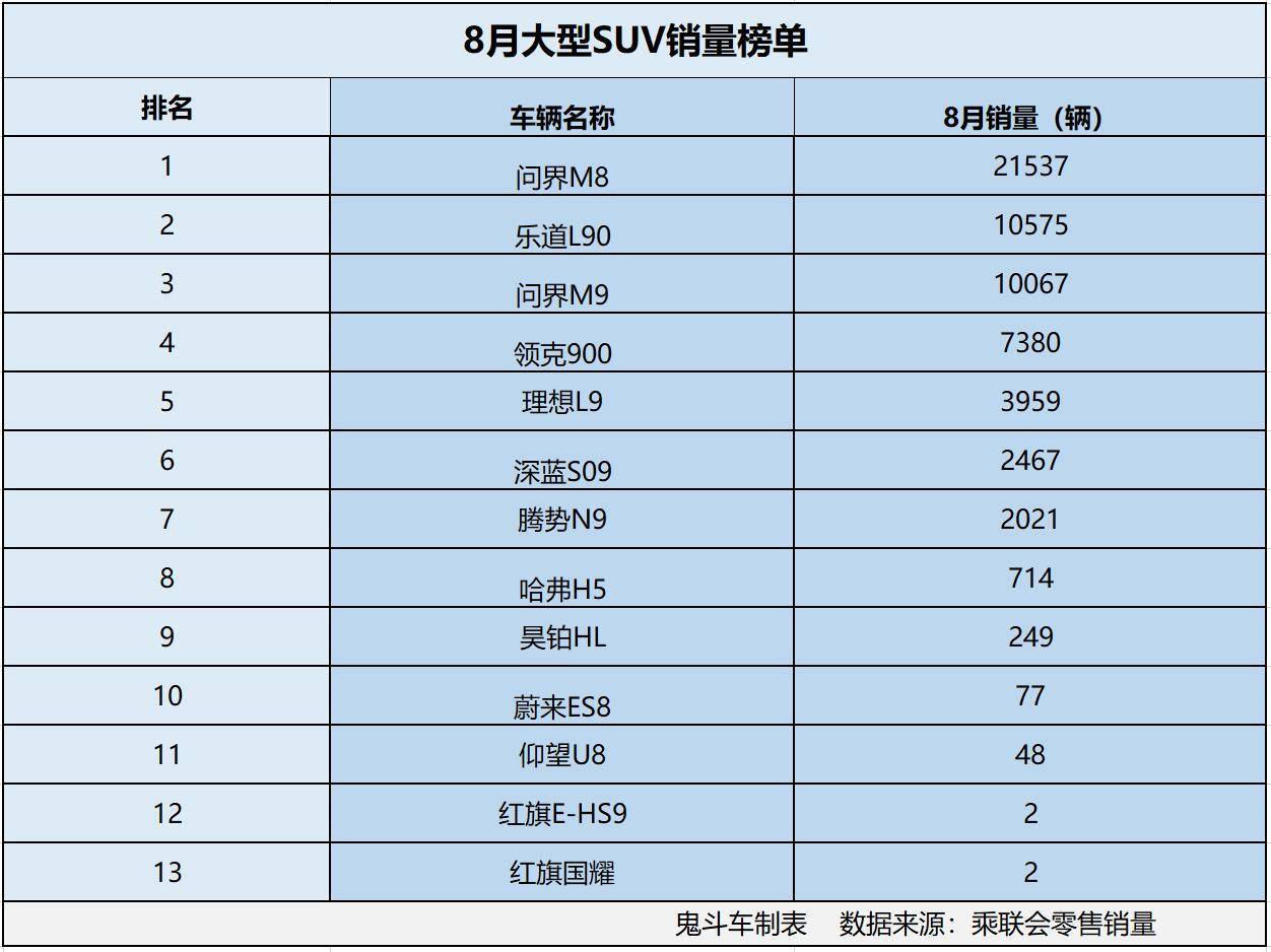 榜單上,共有三款大型SUV的銷量超過萬輛,其中,排名第一位的車型是問界M8,8月零售銷量達(dá)到21537輛,這款車型上市后熱度上升很快,設(shè)計(jì)、尺寸、空間、智能方面都做的很到位,切中消費(fèi)者的用車需求,受到中產(chǎn)階層的認(rèn)可。