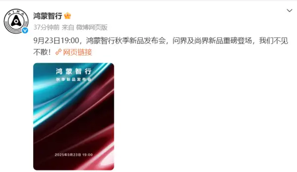 9月19日,CNMO注意到,鴻蒙智行官方宣布,鴻蒙智行秋季新品發布會將于9月23日19:00正式舉行,屆時問界及尚界新品將重磅登場。