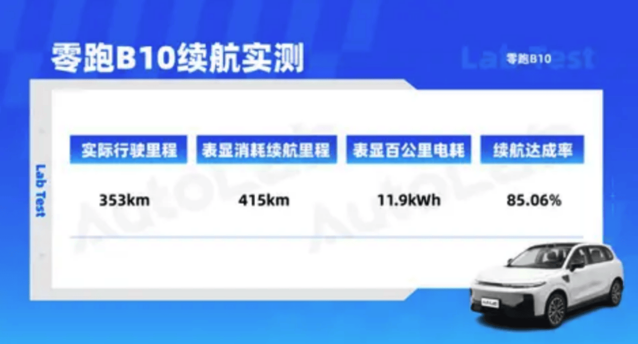 在網(wǎng)上查了查,「Autolab」、「汽車天涯」測試過零跑B10的電耗。這兩家自媒體的創(chuàng)始人我比較熟,人靠譜,也都有從業(yè)多年的經(jīng)驗。Autolab測試零跑B10高架/高速85.06%達(dá)成率,汽車天涯測的夏季市區(qū)達(dá)成率90.3%、高速/省道/山路達(dá)成率81.3%。
