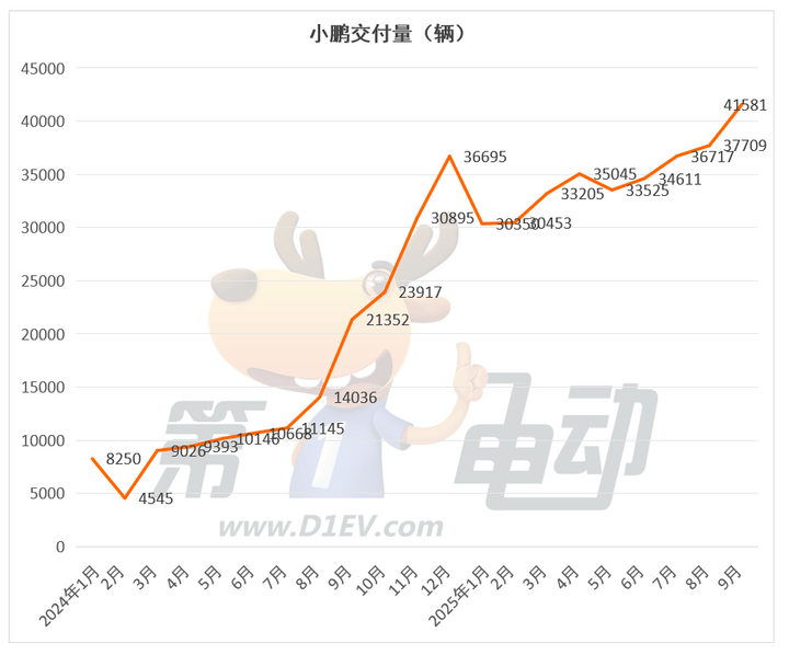 小鵬9月交付41581輛,環比增長10.3%,同比增幅達95%,創歷史新高。2025年1-9月,小鵬汽車累計交付新車313,196臺,同比增長218%。