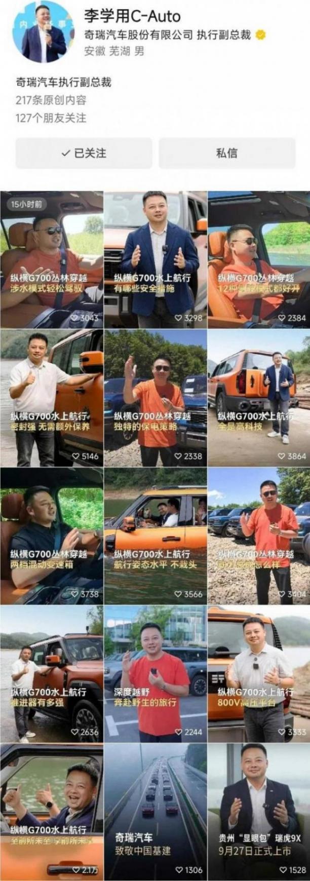 沒有數(shù)錯的話,過去這個國慶假期里面,李學(xué)用在個人IP賬號上前后累計密集發(fā)布了13條營銷小視頻,而且全部都是圍繞和聚焦縱橫G700這款戰(zhàn)略產(chǎn)品。