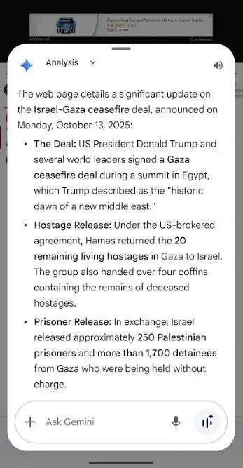 此時屏幕底部會彈出“頁面工具”菜單,用戶選擇帶有 Gemini 標(biāo)志的“詢問 Gemini”(Ask Gemini)選項,隨后在彈出的 Gemini 界面中點(diǎn)擊“總結(jié)”按鈕,即可獲得當(dāng)前頁面的內(nèi)容摘要。