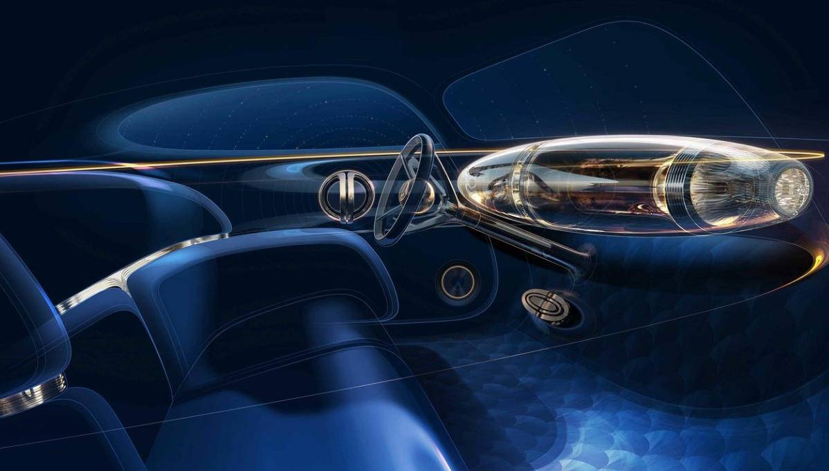 這款車并沒有堆砌屏幕,而是把老物件的精致感和現代科技混搭在一起,比如把深海貝殼做成了裝飾板,光線一照,泛出不同顏色的光,車門也用這種貝殼材質,紋路環繞著金屬門把手。前排座椅是一張寬大的藍色天鵝絨長沙發,車輛的地板采用了17世紀流傳下來的麥稈鑲嵌手藝,工匠們需要把麥稈一點點拼成幾何圖案。