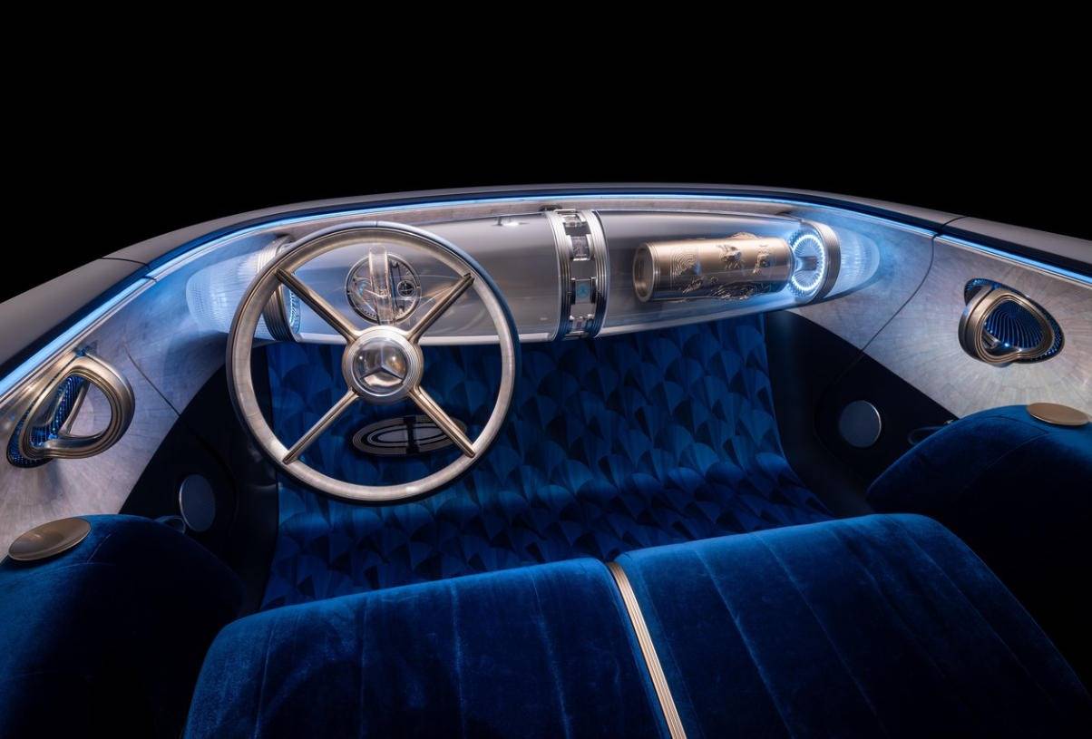 Vision Iconic新車還有一個特點就是玻璃內飾,中控臺中央嵌入了名為齊柏林的懸浮式玻璃結構,而齊柏林是一艘飛艇的名稱,內飾前部就像一個透明的飛艇,把必要的屏幕和按鍵都優雅地包在了里面,不像一塊死板的大黑屏幕立在前面,但這套設計能不能量產還要打一個問號。目前奔馳沒有公布如何操作這些界面,在慕尼黑車展上發布的VISION AVTR,采用腦機接口技術,用戶可以通過腦電波控制屏幕界面。