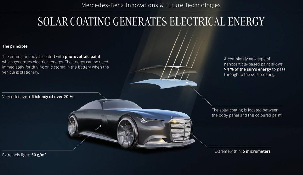 太陽能技術一直是奔馳在研究的方向,此前VISION EQXX概念車就采用了太陽能車頂,搭載117個太陽能電池板,但新一代技術將全車變成太陽能吸收器。如果陽光充足,這套系統單日能增程25公里,收集的太陽能儲存在一個輕質磷酸鐵鋰電池中,為空調、燈光、信息娛樂系統和其他輔助設備供電。