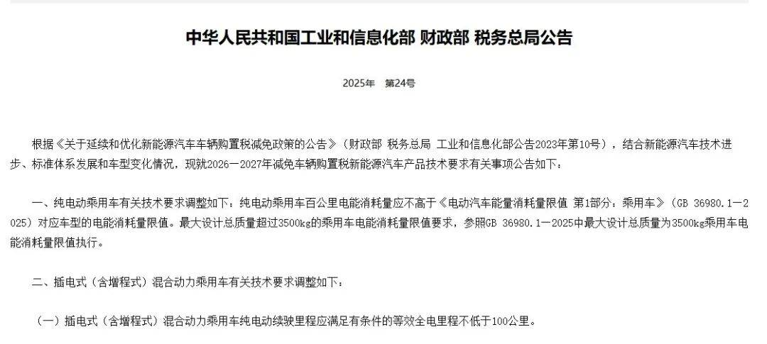 10月9日,工信部等三部門聯合發布公告,明確自2026年1月1日起,插電混動車型享受購置稅減免的純電續航門檻從43公里提升至100公里。