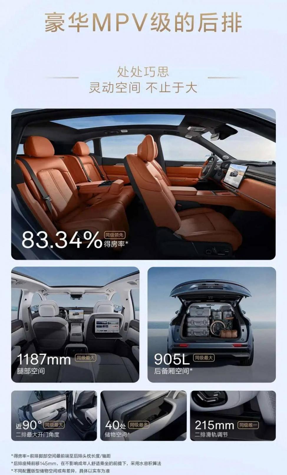 內飾方面,新款7X(參數|詢價)新增黑紫和黑橙兩款內飾配色。車輛基于SEA浩瀚架構,以4825mm的車身長度實現2925mm軸距,配合863mm短前懸設計,座艙得房率超過83.34%。同時,車輛還擁有1021mm頭部空間與1187mm腿部空間以及905L后備廂空間。全車共40處儲物空間。配置方面,車輛配備后排雙側電動遮陽簾/隱私玻璃,-6℃-50℃溫度調節的冷箱箱、后排電動桌板/電動智慧屏等。