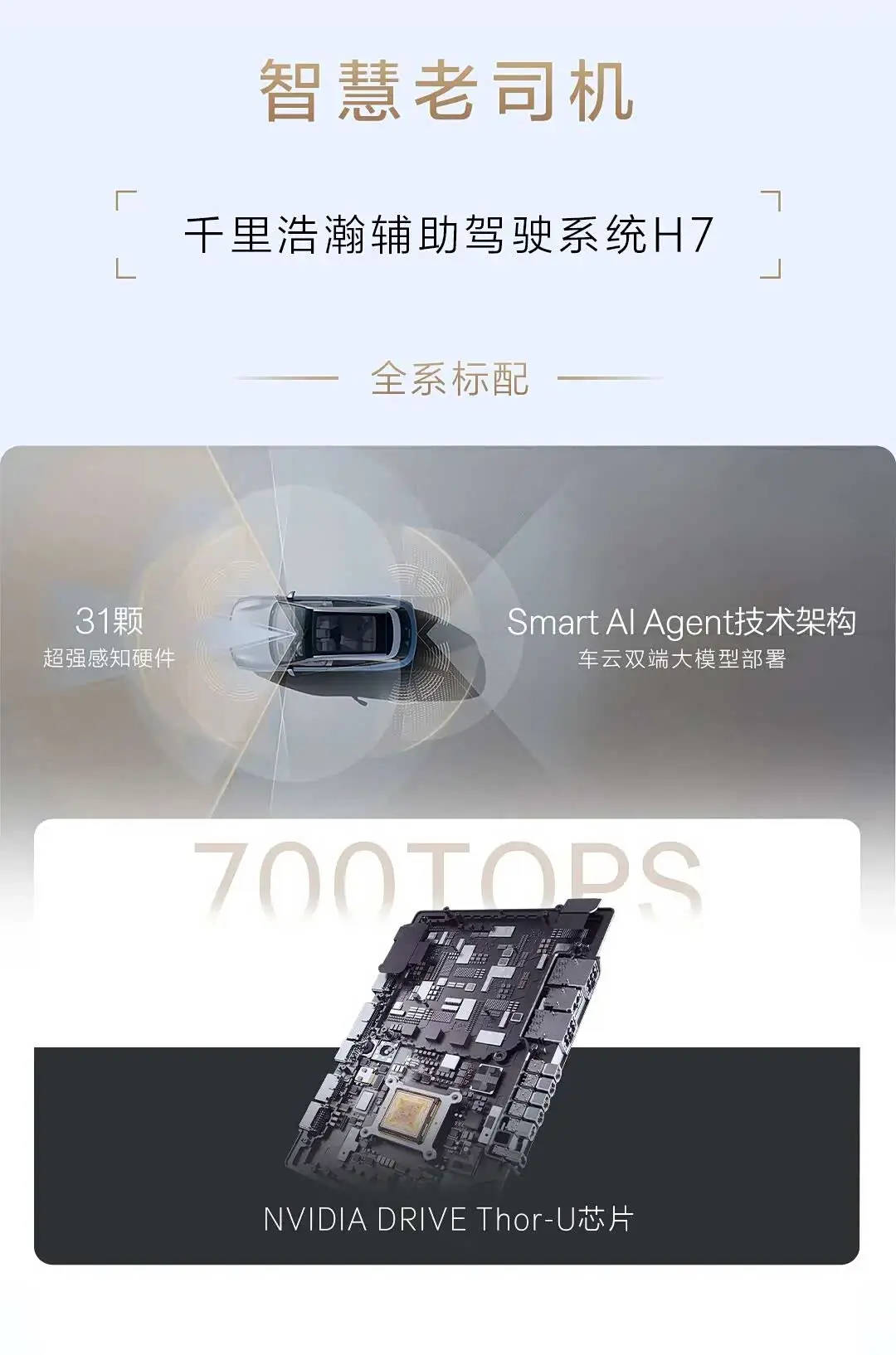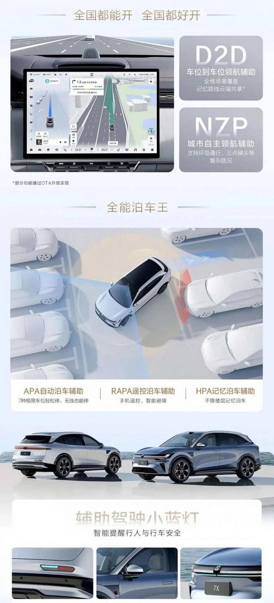 輔助駕駛方面,新款極氪7X全系標配千里浩瀚輔助駕駛系統H7,31顆感知硬件搭配最高算力達700TOPS的英偉達Thor-U芯片,再加上Smart AI Agent技術架構的加持。可實現D2D車位到車位領航輔助、NZP城市自主領航輔助、APA自動泊車輔助、RAPA遙控泊車輔助等泊車功能。