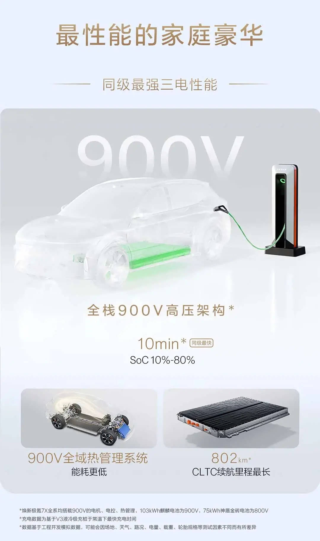 動力方面,車輛全新升級900V高壓架構,全系搭載900V的電機、電控和熱管理系統。相比現款,三個版型的動力、能耗和續航都有所優化。單電機后驅車型最大功率為370kW,配備75kWh和103kWh神盾金磚電池,SoC 10%-80%最快僅需10.5分鐘,CLTC續航里程分別為620km、802km,0-100km/h加速時間為5.4s/5.1s。雙電機四驅車型最大功率為585kW,配備103kWh麒麟電池,SOC 10%-80%充電時間為10分鐘,CLTC續航里程為715km,0-100km/h加速時間為2.98s。