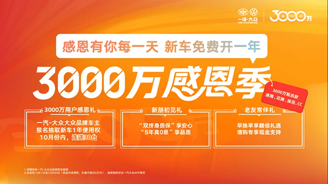 為回饋超2000萬新老客戶的支持與信賴,一汽-大眾大眾品牌特推出“3000萬感恩季”活動,既有真金白銀的現金優惠,又為新老車主提供毫無后顧之憂的雙終身保障,同時更有甄選用戶所需加量不加價的3000萬甄選款車型問世,一汽-大眾大眾品牌以誠意之姿,回應3000萬用戶信賴。