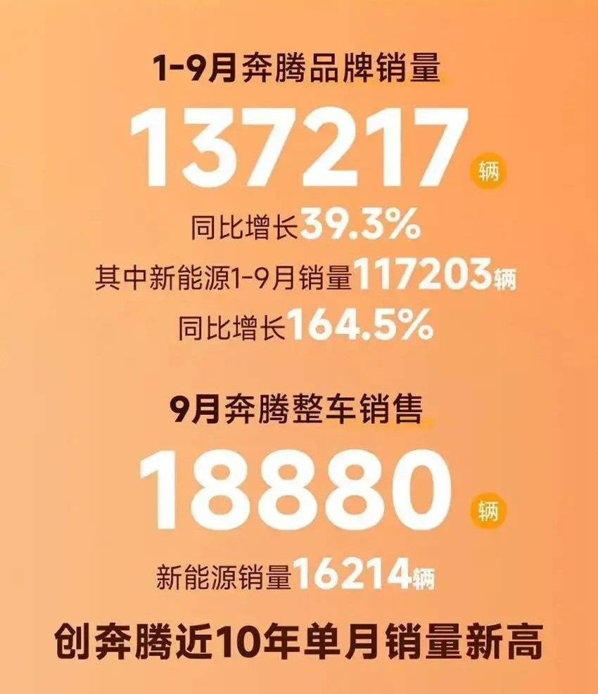 在今年過去的9個(gè)月中,奔騰銷量達(dá)到137217輛,同比增長(zhǎng)39.3%,而其中新能源車型銷量117203輛,同比增長(zhǎng)164.5%,單單一個(gè)9月份,整車就銷售了18880輛,新能源車賣了16214輛,創(chuàng)了奔騰品牌近十年來(lái)單月銷量的最高成績(jī)。